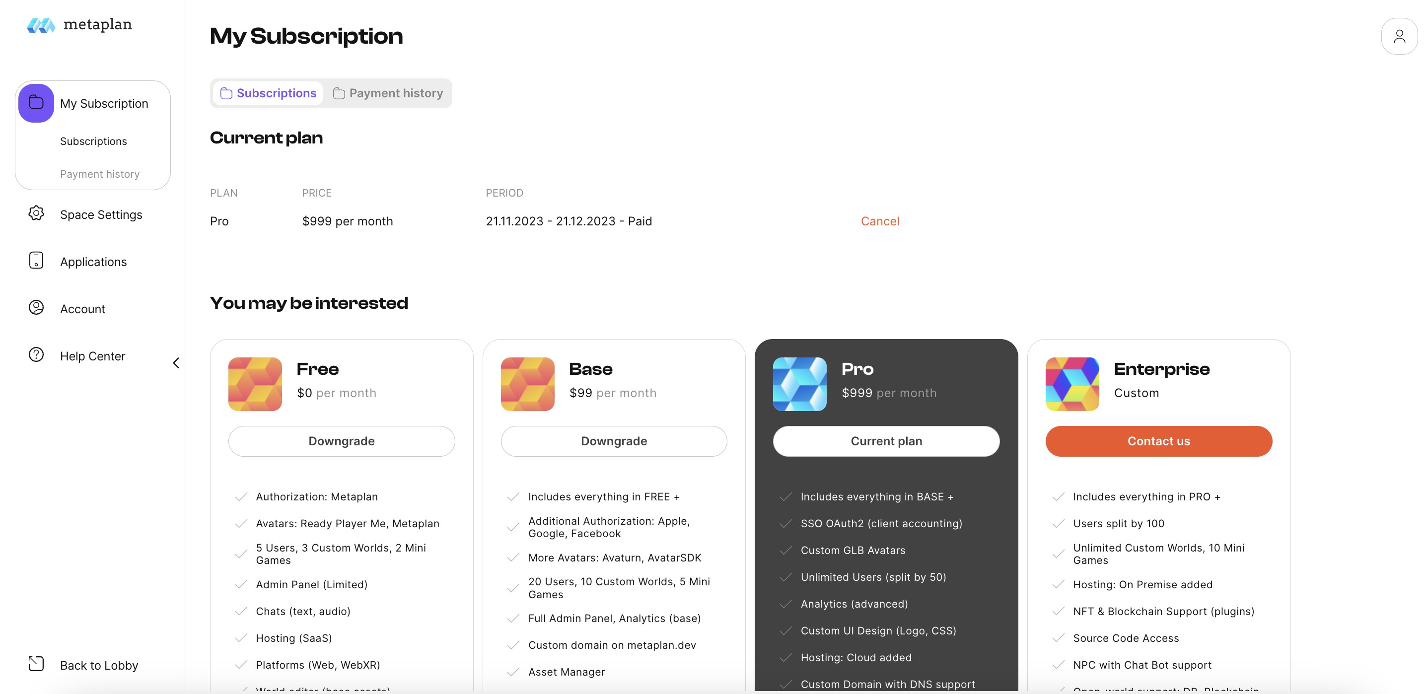 all available subscription types, and your payment history.