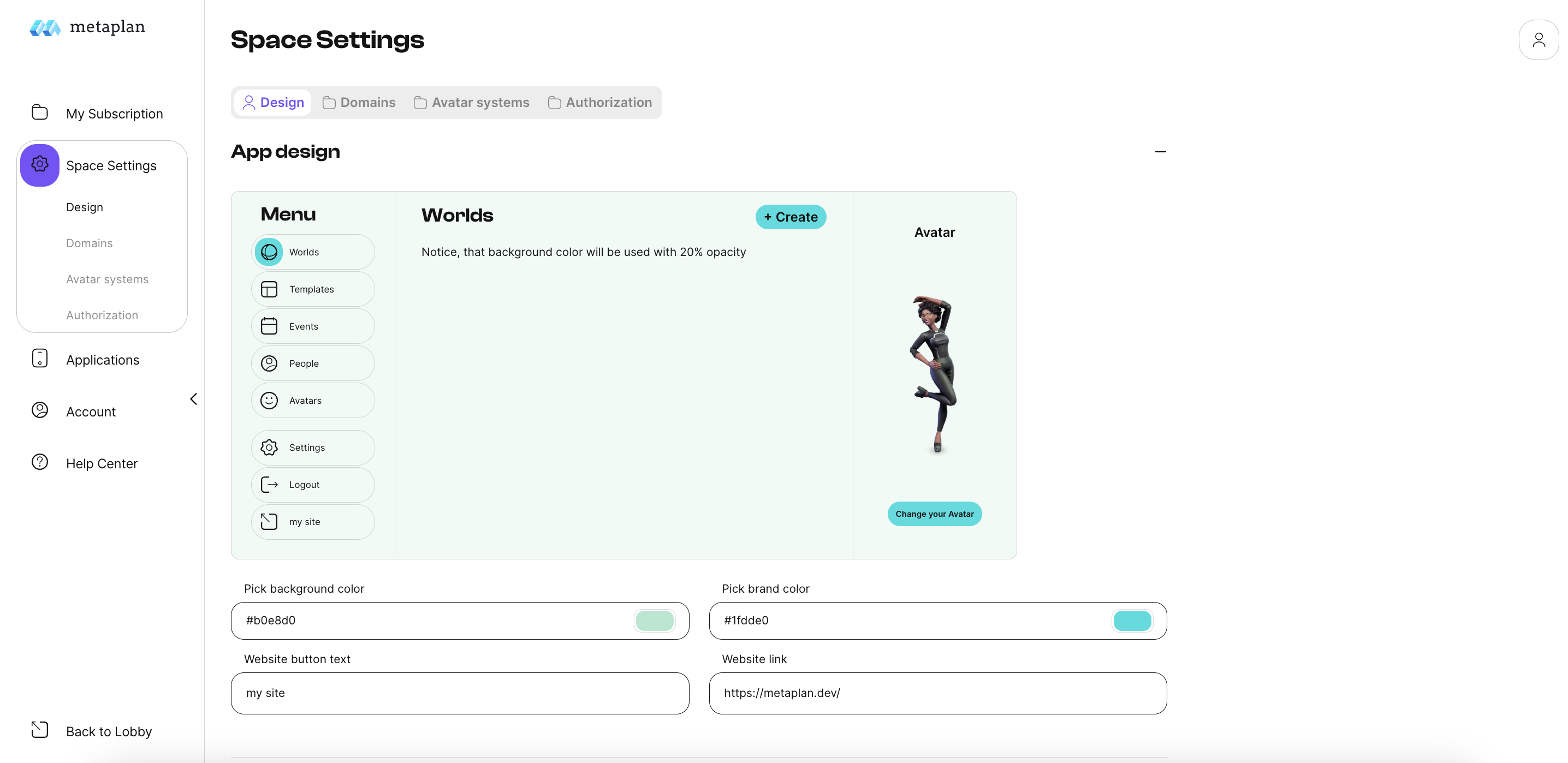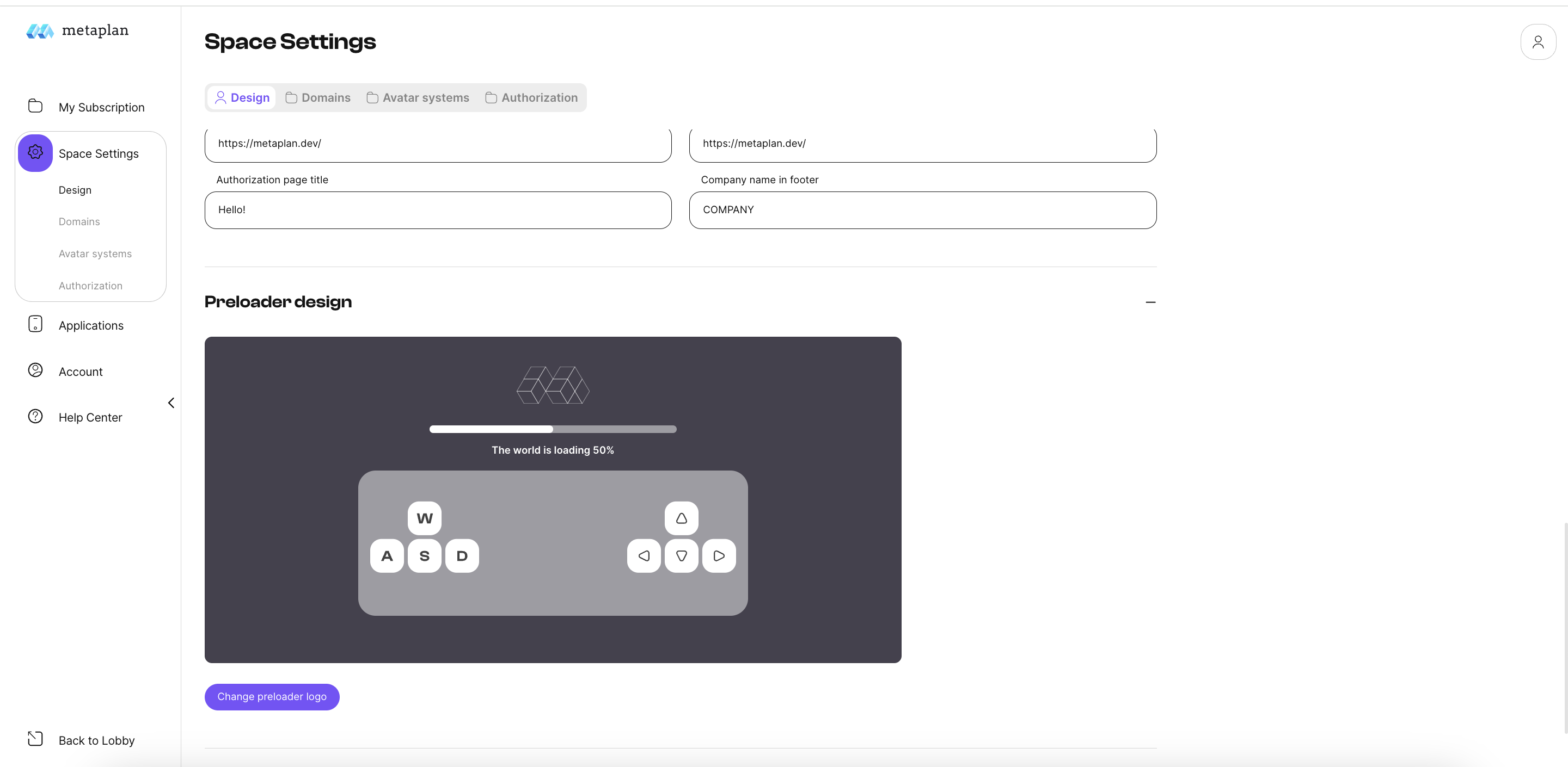 The Design subsection allows you to customize the look of your platform - the 2D lobby.