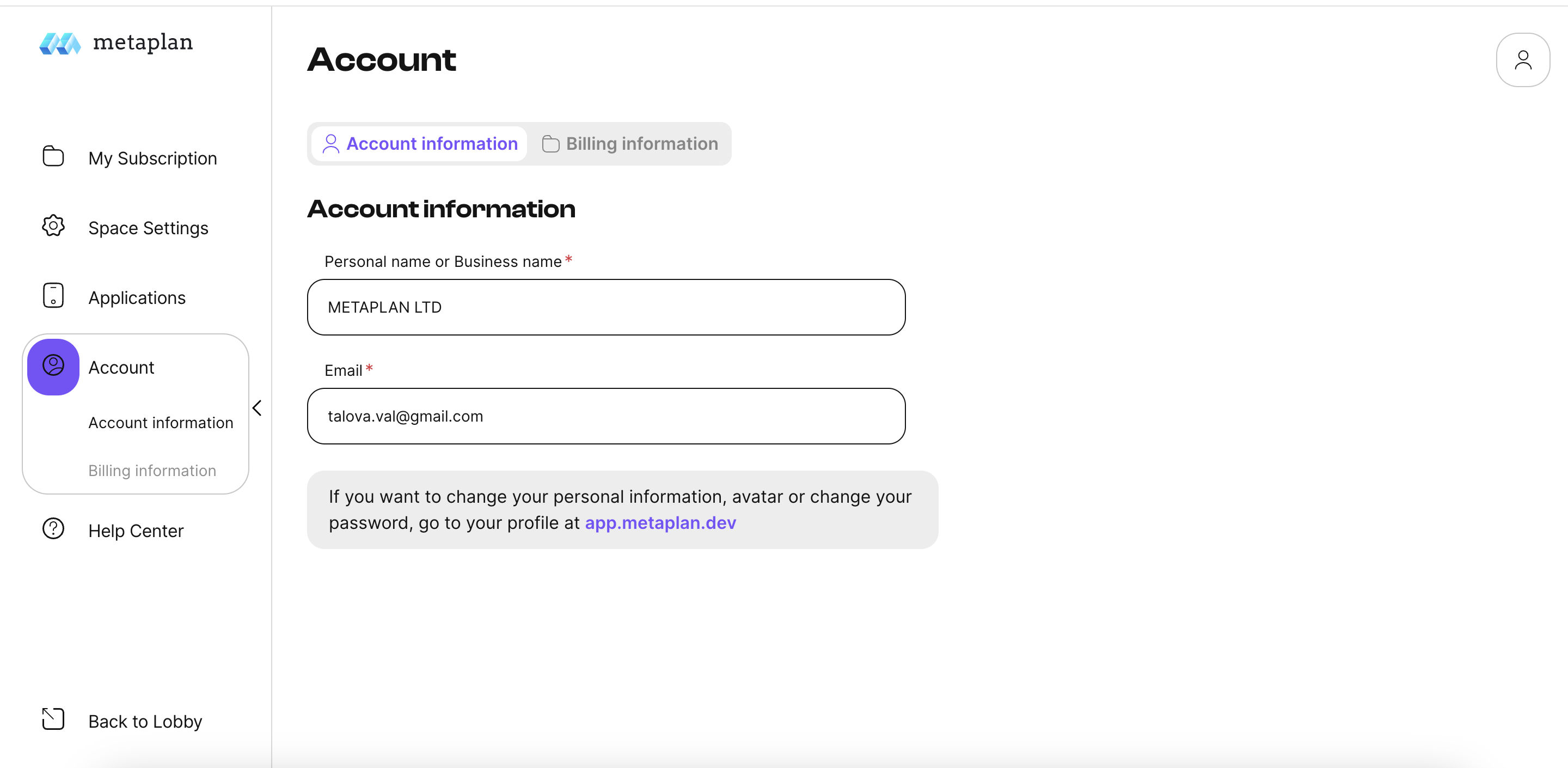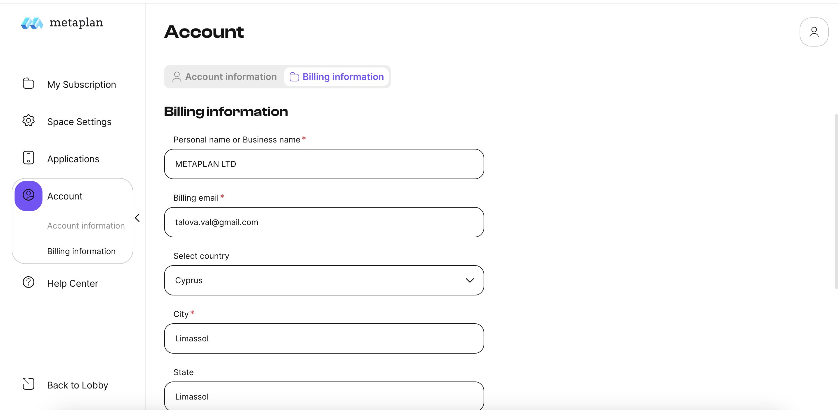 and Billing information, where you can add/update billing information and add an email address to receive invoices.