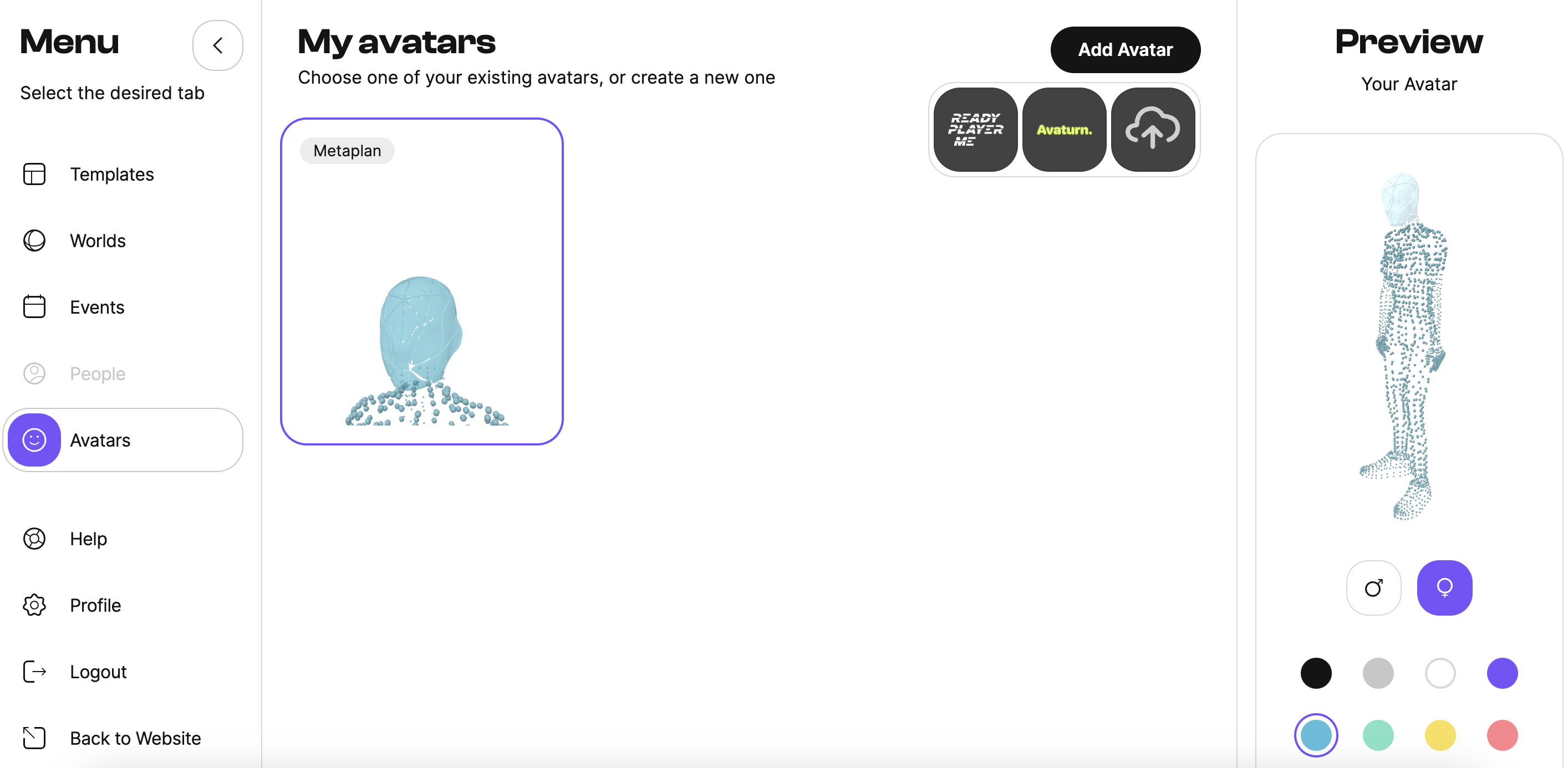 You can change the gender and color of your Metaplan avatar through the Avatar Settings menu.